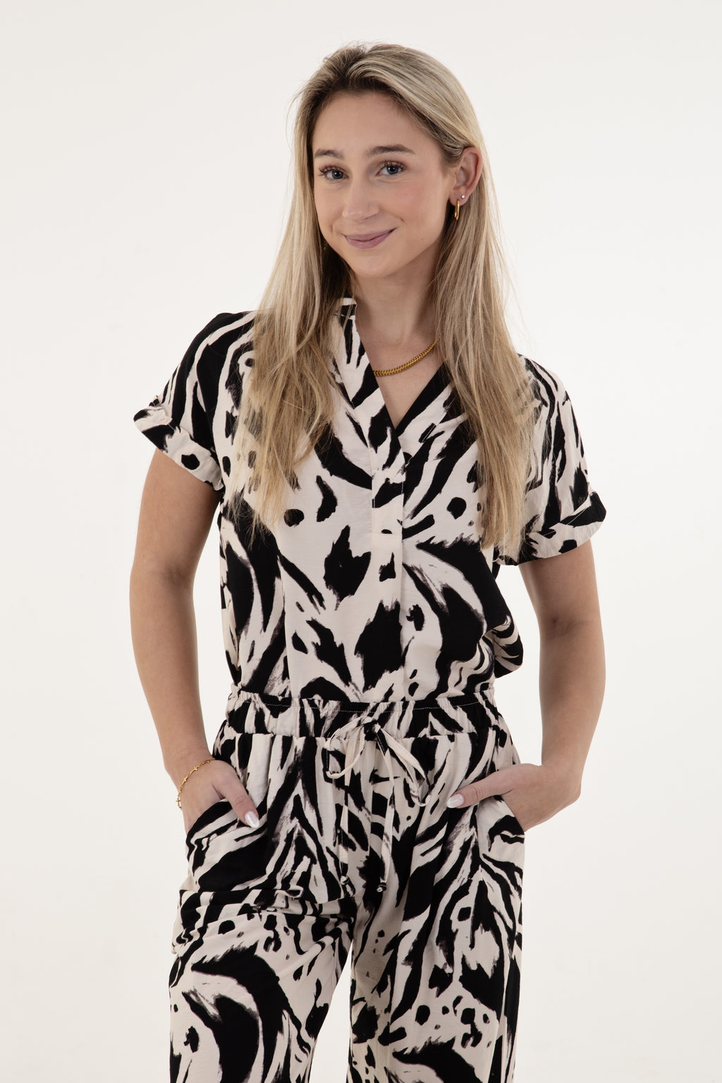 Black & Cream Abstract V-Neck Roll Sleeve Top